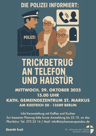 Am Mittwoch, 29.10., laden wir um 15 Uhr zu einer Infoveranstaltung in den Gemeindesaal von St. Markus (Am Kiesteich 50) ein. Die Polizei informiert vor allem ältere Menschen über das Vorgehen von Trickbetrügern und gibt Tipps, wie man Betrüger erkennt und sich am Telefon oder an der Haustür am besten verhält. Bei Kaffee und Kuchen kommen wir zu diesem Thema ins Gespräch - der Eintritt ist frei. Um Anmeldung zur besseren Planung wird bis zum 22.10. gebeten: info@st-johannes-spandau.de