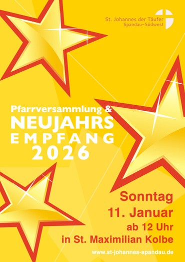Das neue Jahr hat begonnen - wir wollen darauf anstoßen! Am Sontag, 11. Januar, um 12.00 Uhr laden Pfarreirat und Kirchenvorstand herzlich zum Neujahrsempfang mit Pfarrversammlung nach St. Maximilian Kolbe ein. Eine gute Gelegenheit, auf das vergangene Jahr zurückzublicken und einen Ausblick auf das vor uns liegende zu werfen. Auch die Sternsinger werden uns zum Abschluss ihrer diesjährigen Aktion besuchen.