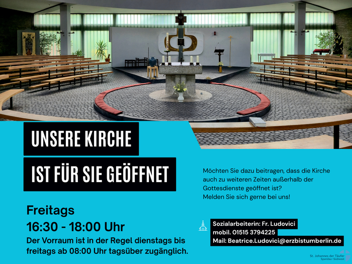 Von Dienstag bis Freitag ist bislang leider nur der Vorraum der Kirche von 08.00 Uhr bis zum Nachmittag geöffnet - durch die Glastür kann in den Kirchenraum geschaut werden, eine Sitzgelegenheit und eine Kniebank sind im Vorraum vorhanden. Sie möchten gerne, dass auch der Innenraum öfters/länger geöffnet ist? Wir heißen Freiwillige, die den Dienst des Kirchenöffnens verantwortlich und regelmäßig übernehmen wollen, herzlich willkommen - melden Sie sich dazu bei unserer Sozialarbeiterin: beatrice.ludovici@erzbistumberlin.de