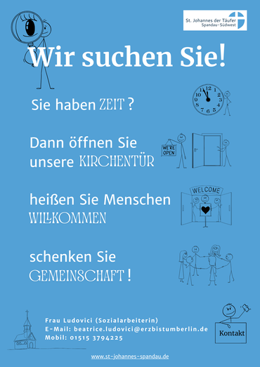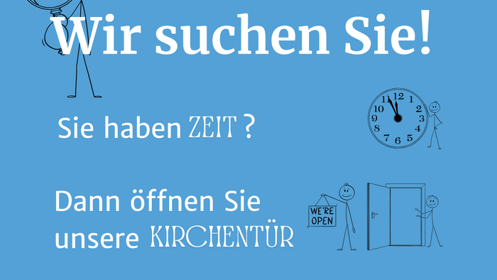 Dafür brauchen wir Ihre Mithilfe! Schenken Sie Ihre Zeit, indem Sie eine Kirchentür in der Pfarrei öffnen, den Besucher*innen ein freundliches Lächeln oder ein kurzes Gespräch schenken und so die Kirche zu einem Ort zu machen, an dem Menschen gerne vorbeikommen.