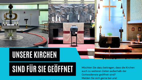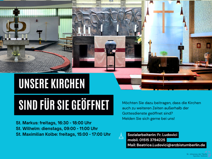 Sie möchten gerne, dass eine unserer Kirchen öfters/länger geöffnet ist? Wir heißen Freiwillige, die den Dienst des Kirchenöffnens verantwortlich und regelmäßig übernehmen wollen, herzlich willkommen - melden Sie sich dazu bei unserer Sozialarbeiterin: beatrice.ludovici@erzbistumberlin.de