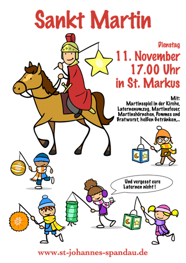 In guter Tradition laden wir am Di., 11.11. wieder um 17.00 Uhr zum Martinsfest nach St. Markus ein. Nach dem Martinsspiel in der Kirche startet der Laternenumzug durch die Nachbarschaft. Anschließend feiern wir am Martinsfeuer vor der Kirche weiter, die Schützen sorgen dabei für unser leibliches Wohl und auf jedes Kind wartet natürlich auch wieder ein Martinshörnchen.