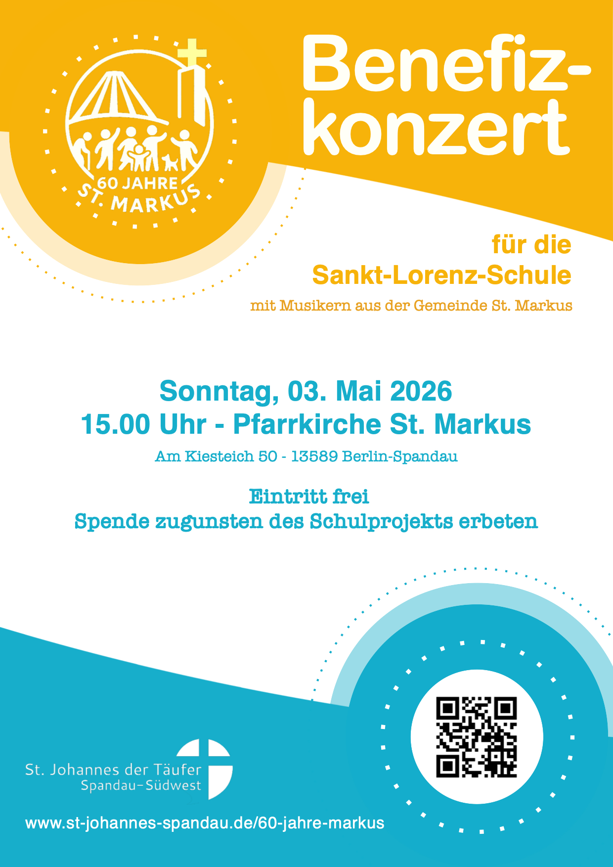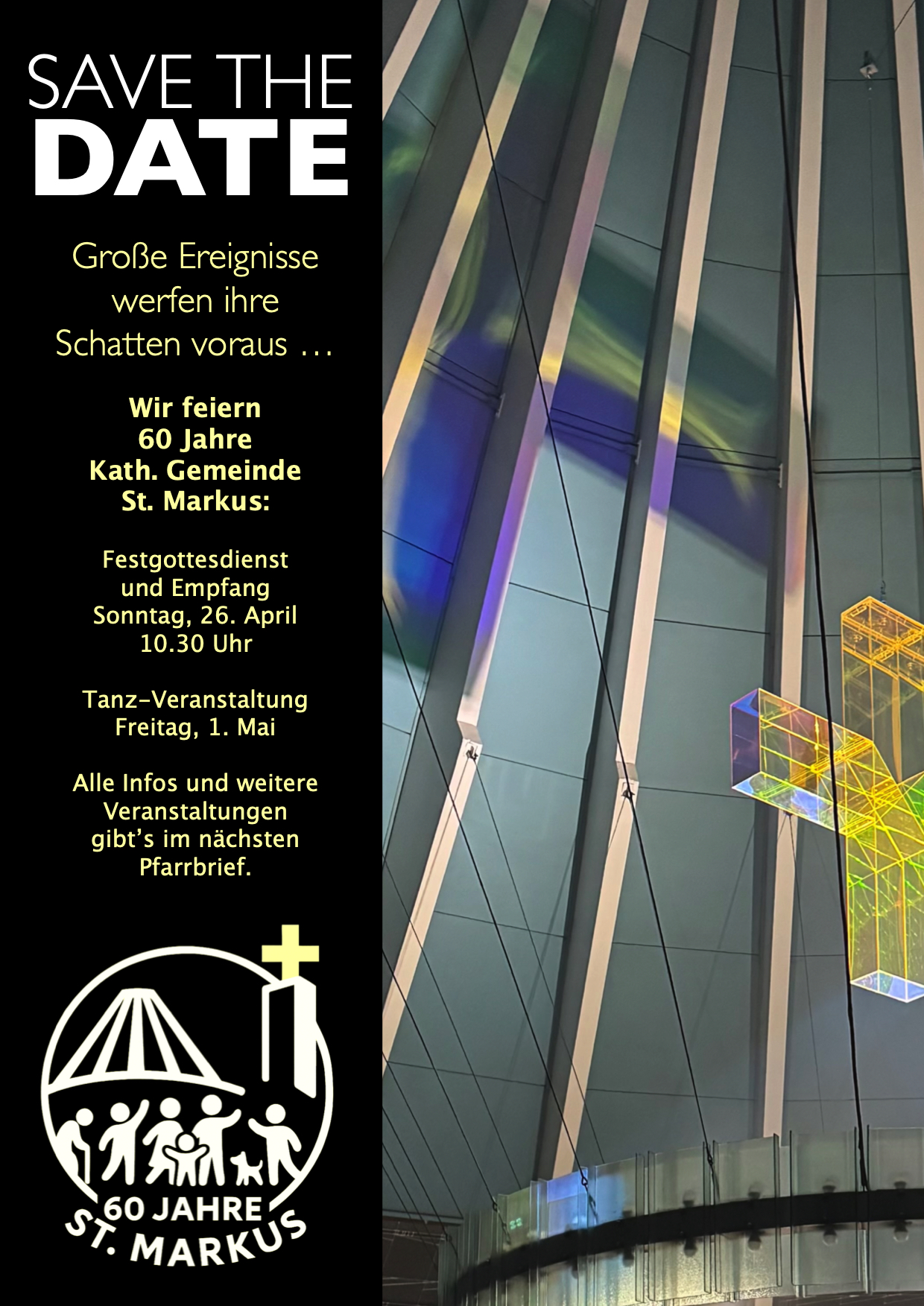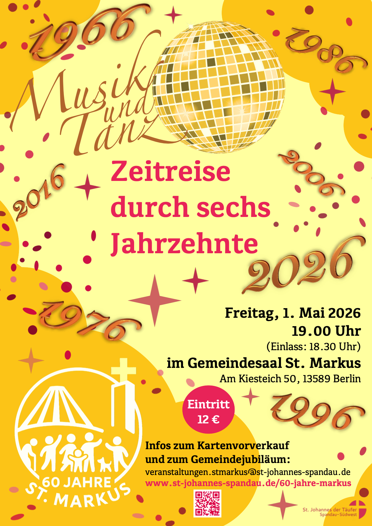 Wir feiern eine Jubiläums-Party im Gemeindesaal! Egal ob mit Pettycoat oder Schlaghosen, ob als Disco-Queen das Tanzbein schwingen oder ganz lässig auf der Neuen Deutschen Welle surfen. Da ist für jeden was dabei, wenn wir am Freitag, 01.05., ab 19.00 Uhr nicht nur 60 Jahre St. Markus sondern auch die Musik von 1966 bis 2026 feiern. Eine Live-Band sorgt für den richtigen Sound. Eintritt: 12 Euro - Getränke und Berliner Leckerbissen gibt es zu günstigen Preisen.