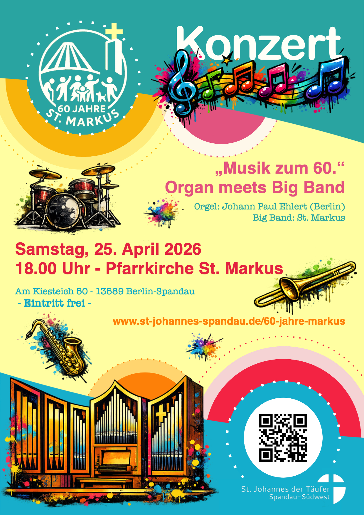 Ein kurzweiliges Konzert zum 60. Geburtstag verspricht das Aufeinandertreffen der Orgel von St. Markus (gespielt von Johann Paul Ehlert) mit einer Big Band am Samstag, 25.04., um 18.00 Uhr in der Pfarrkirche St. Markus. Der Eintritt ist frei, eine kleine Spende für die Kirchenmusik der Gemeinde ist immer willkommen.