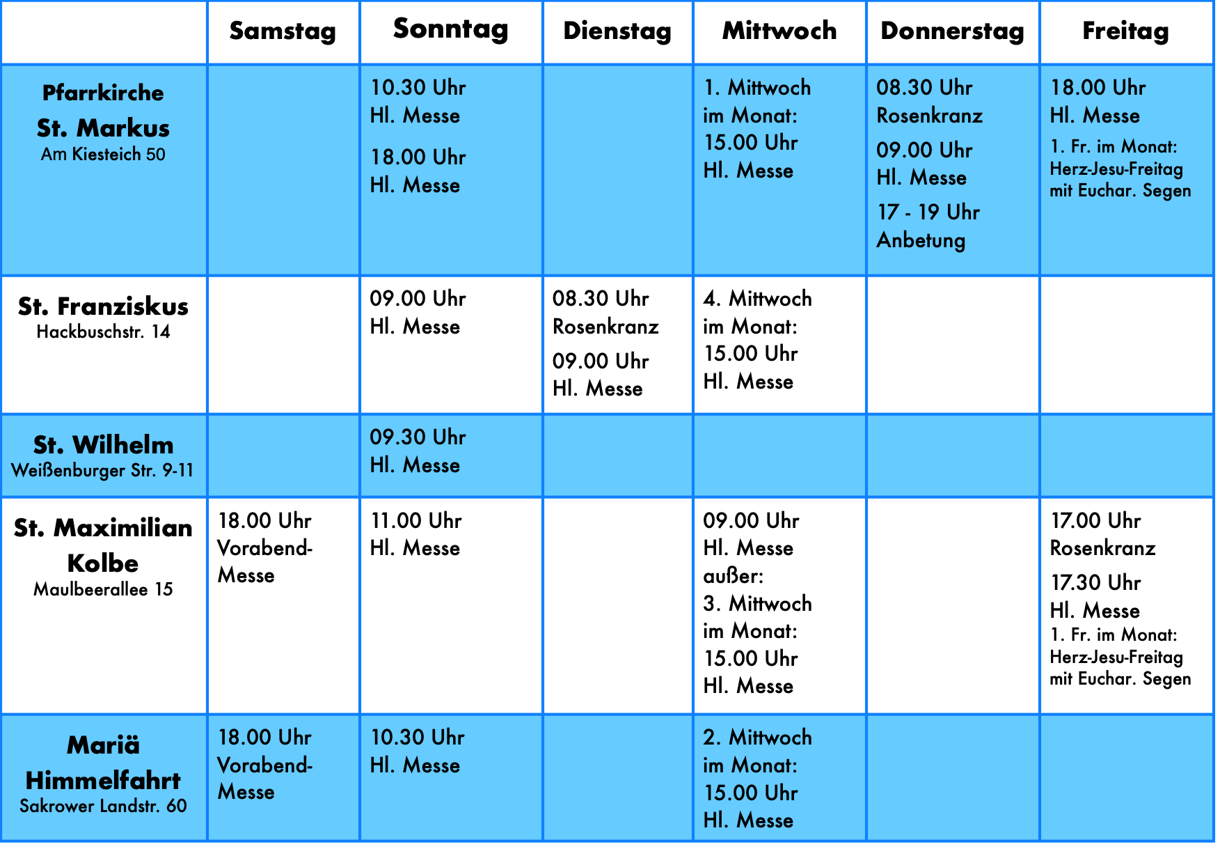 Gottesdienste Hier finden Sie eine Übersicht der regelmäßigen Gottesdienstzeiten sowie den Kalender mit den nächsten Gottesdiensten - aktuelle Übersichten über Gottesdienste der nächsten sieben bis 14 Tage sowie die Vermeldungen bieten unsere Extrablätter. Auch über unsere Gottesdienste für Kinder und die Beichtzeiten können Sie sich hier informieren..