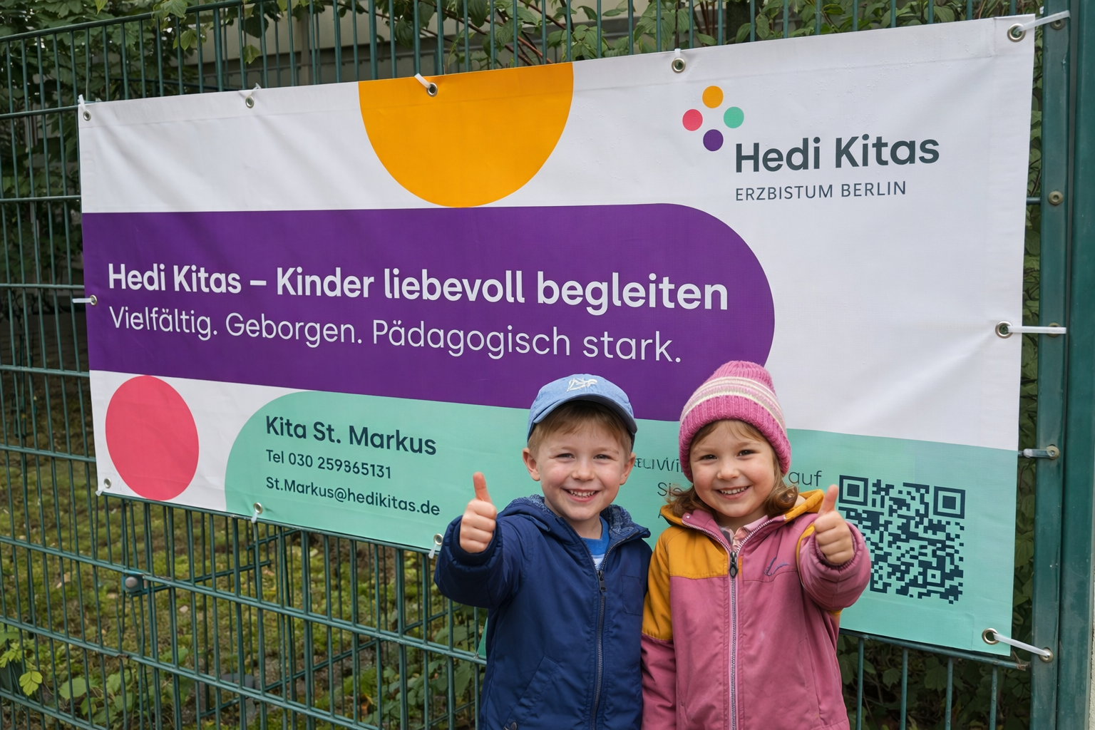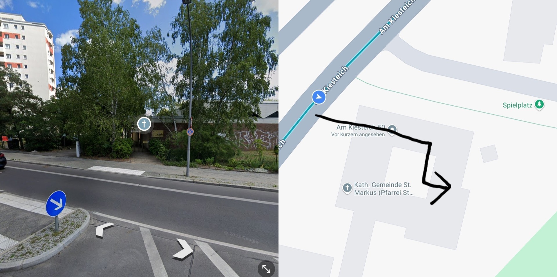 Unsere Kita liegt im Gemeindezentrum St. Markus im Falkenhagener Feld, abseits des Straßenlärms und des Großstadtverkehrs. Unmittelbar daneben befindet sich der Spektepark mit seinen großen Wiesen, Spielplätzen und dem Spektesee (Kiesteich). Fußläufig befinden sich außerdem mehrere Schulzentren. Wir sind gut mit den öffentlichen Verkehrsmitteln (ca. 15 Minuten vom Bahnhof Spandau) zu erreichen.
