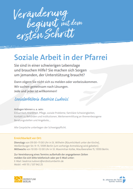 Wir freuen uns sehr, dass Frau Ludovici nun Teil unseres Teams ist. Mit ihrer offenen Art, ihrem Einfühlungsvermögen und ihrer langjährigen Erfahrung ist sie eine große Bereicherung für unsere Gemeinden. Ihr Büro befindet sich in der Gemeinde St. Maximilian Kolbe – und ihre Tür steht immer offen für alle, die ein offenes Ohr, Unterstützung oder einfach ein gutes Gespräch suchen.